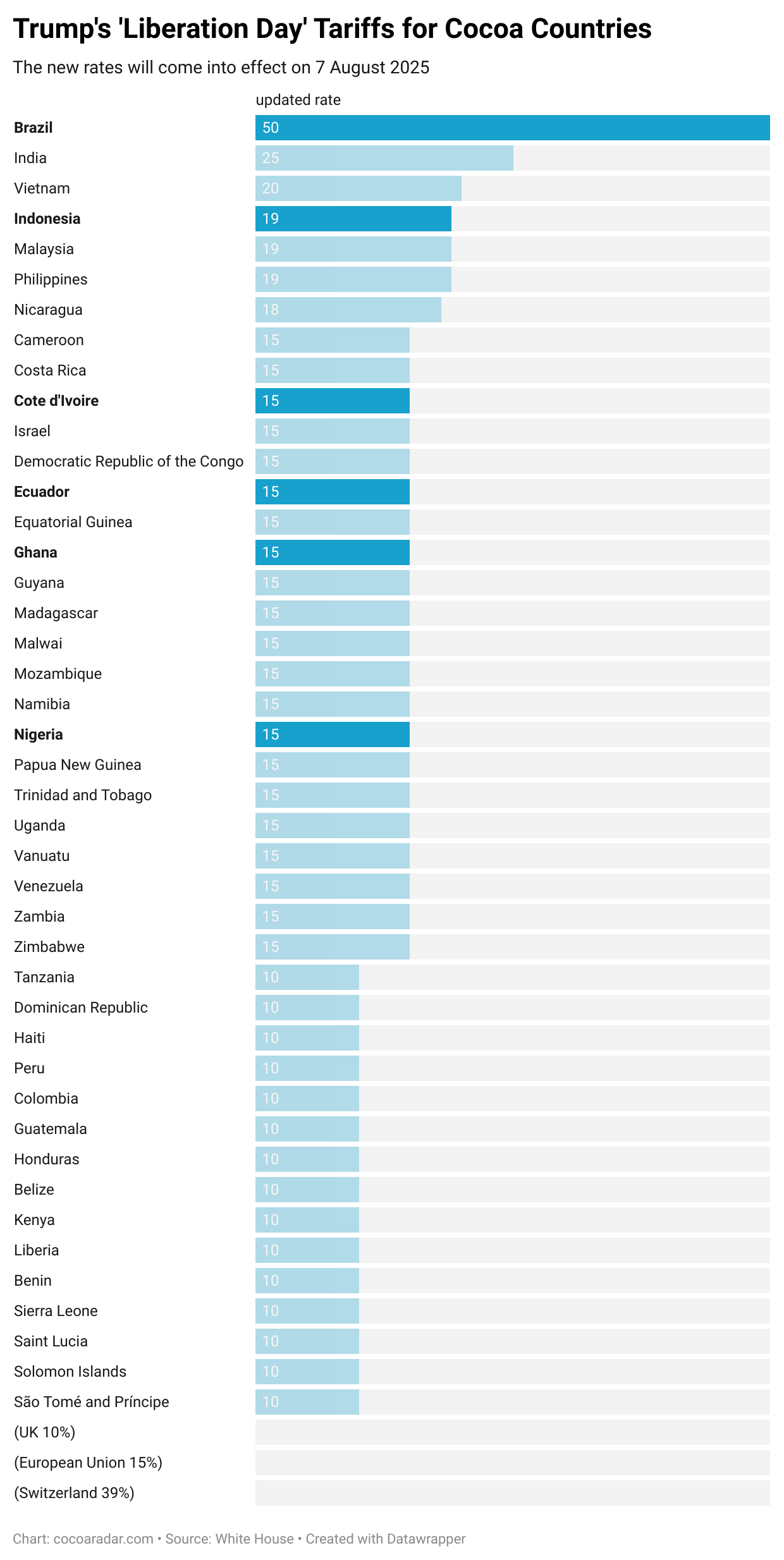 The Trump administration has also imposed a baseline 10% tax on most other cocoa-exporting nations, all countries that lack domestic cocoa production.