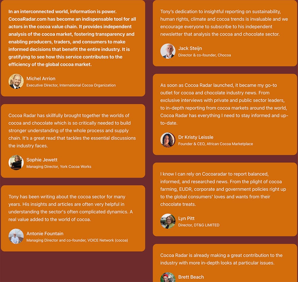Editor Anthony Myers said: “In a world of complex supply chains, this is a valuable resource for the chocolate industry and anyone interested in how cocoa is grown, produced, and sold. Thank you to our project ‘vision partners’ - Picterra, Chocoa African Cocoa Marketplace - for their valued input and helping cocoaradar.com launch this important resource.”