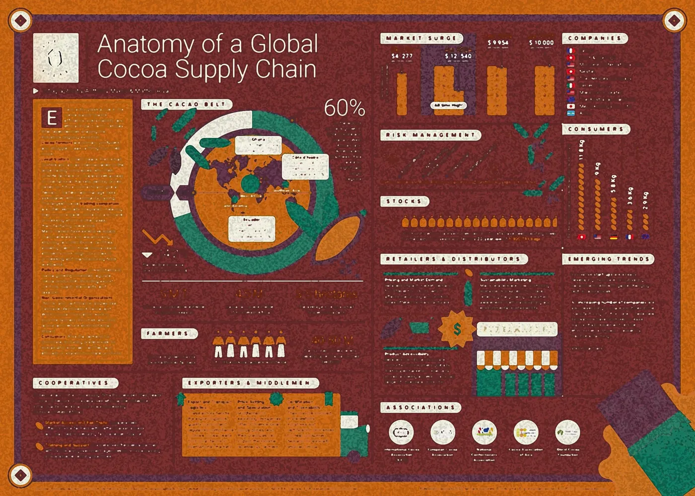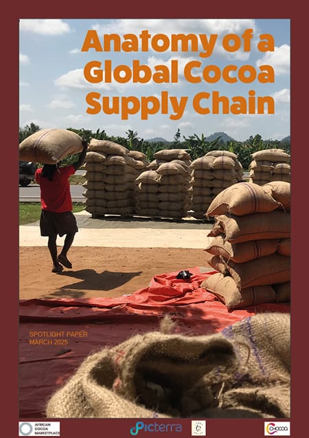 The stunningly designed infographic unravels the intricacies of the Global Cocoa Supply Chain, mapping out the entire journey from smallholder farms to the hands of consumers. Delve deeper into the roles of smallholder farmers, intermediaries, exporters, processors, and the dominant trading houses with the more detailed Spotlight Paper.