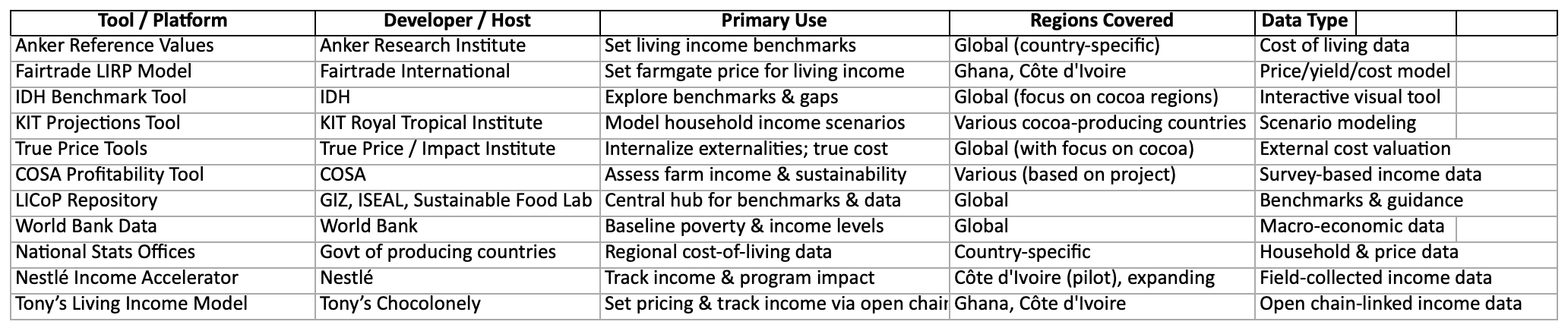 Other tools, platforms, and methodologies used to calculate farmer living income in the cocoa sector. These are widely used by NGOs, certifiers, chocolate companies, and researchers: