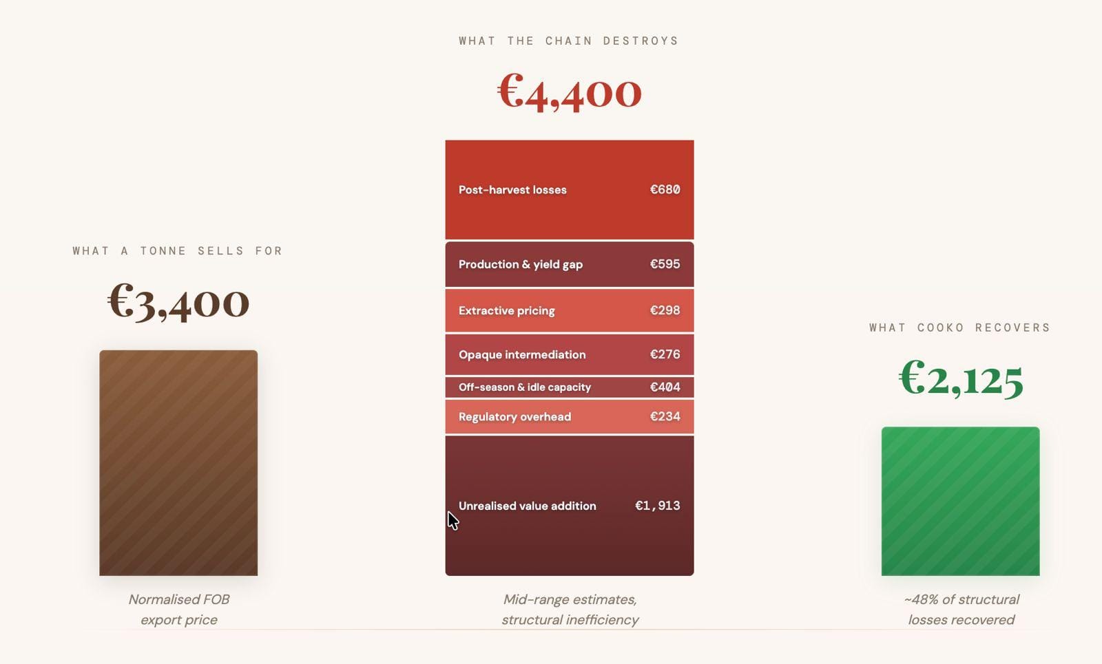 Here is an uncomfortable number for your Tuesday morning: for every tonne of cocoa that leaves West Africa, an estimated €4,400 in value is destroyed, extracted, or left on the table by a supply chain that has barely changed in decades. That is more than the bean itself is worth at current FOB prices.