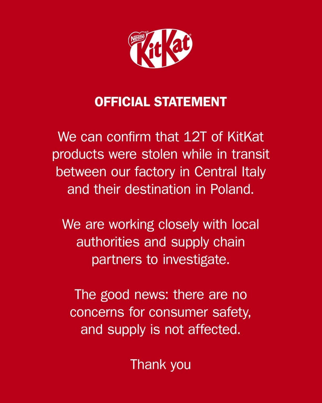 According to Nestlé, the shipment – part of a new KitKat product line – disappeared last week and remains missing at the time of writing. The company has stated that the stolen bars can be traced through batch codes and warned that they may surface through unofficial or grey-market sales channels. Both Reuters and the Associated Press independently confirmed these details.
