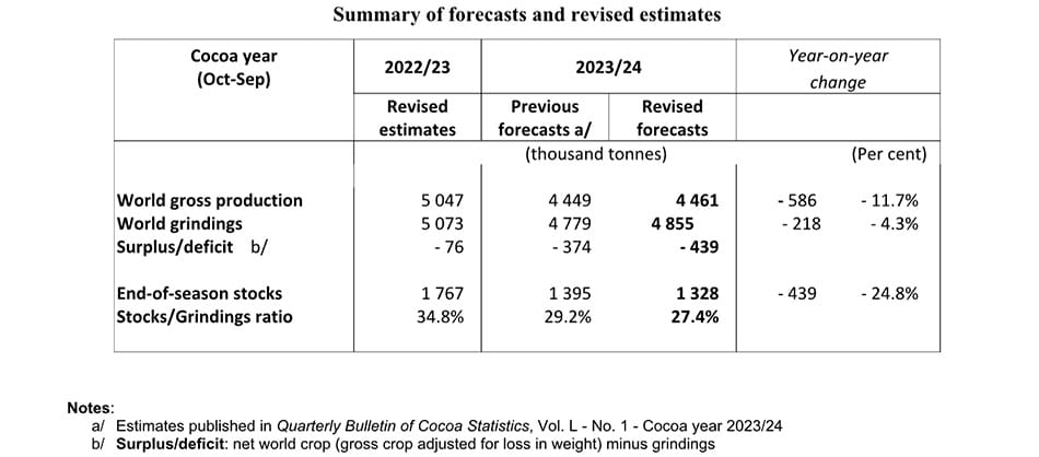 The International Cocoa Organization (ICCO) has released its revised forecasts for the 2023-24 cocoa year. As the 2023-24 season progresses, it will undoubtedly end with a higher deficit than previously expected.